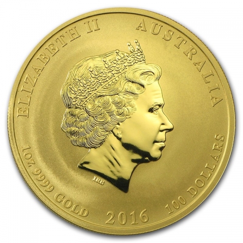 Золотая монета 100 долларов "Лунный календарь 2- Год Обезьяны" 31,1г., 1 унция, 2016 г., Австралия