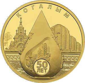 рельефные изображения: в центре – скульптурной композиции «Капля жизни», слева – храма святой мученицы Татианы, справа – городских домов; нижнюю часть монеты пересекает рельефная орнаментальная полоса; надписи: вверху по окружности – «КОГАЛЫМ», внизу в круглой рамке в две строки – «50 ЛЕТ».