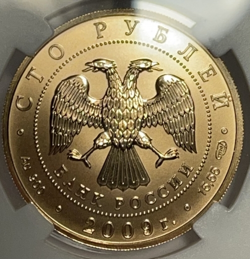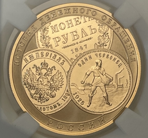 Золотая монета 100 рублей "История Денежного Обращения" 2009 г. в слабе ННР MS 70