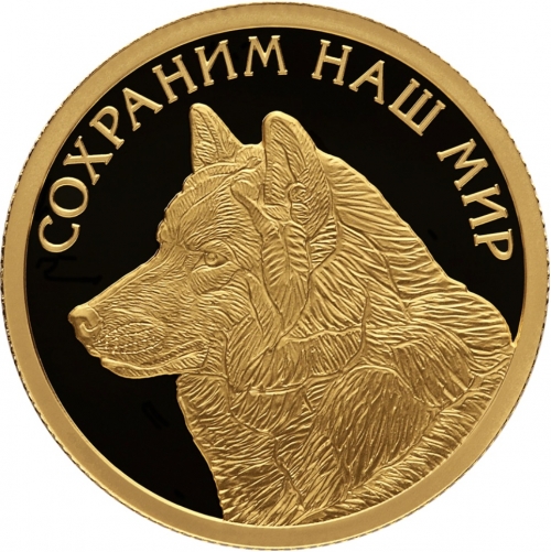 рельефное изображение полярного волка; вверху по окружности имеется надпись: «СОХРАНИМ НАШ МИР».