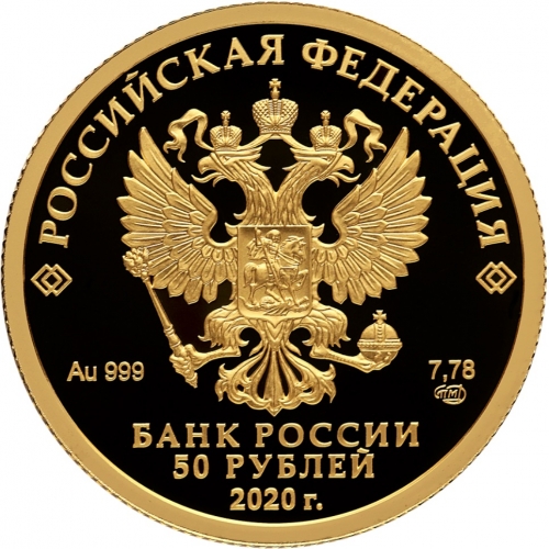 в центре – рельефное изображение Государственного герба Российской Федерации, имеются надписи: «РОССИЙСКАЯ ФЕДЕРАЦИЯ», «БАНК РОССИИ», номинал монеты «50 РУБЛЕЙ», дата: «2020 г.», обозначение металла по Периодической системе элементов Д.И. Менделеева, проба сплава (проба), товарный знак Санкт-Петербургского монетного двора (СПМД) и масса драгоценного металла в чистоте.