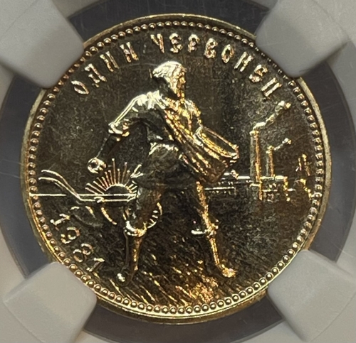 Изображение крестьянина-сеятеля на фоне плуга, восходящего солнца и заводов; по краю монеты точки, вверху надпись - «ОДИН ЧЕРВОНЕЦ», внизу слева — год выпуска - 1981.